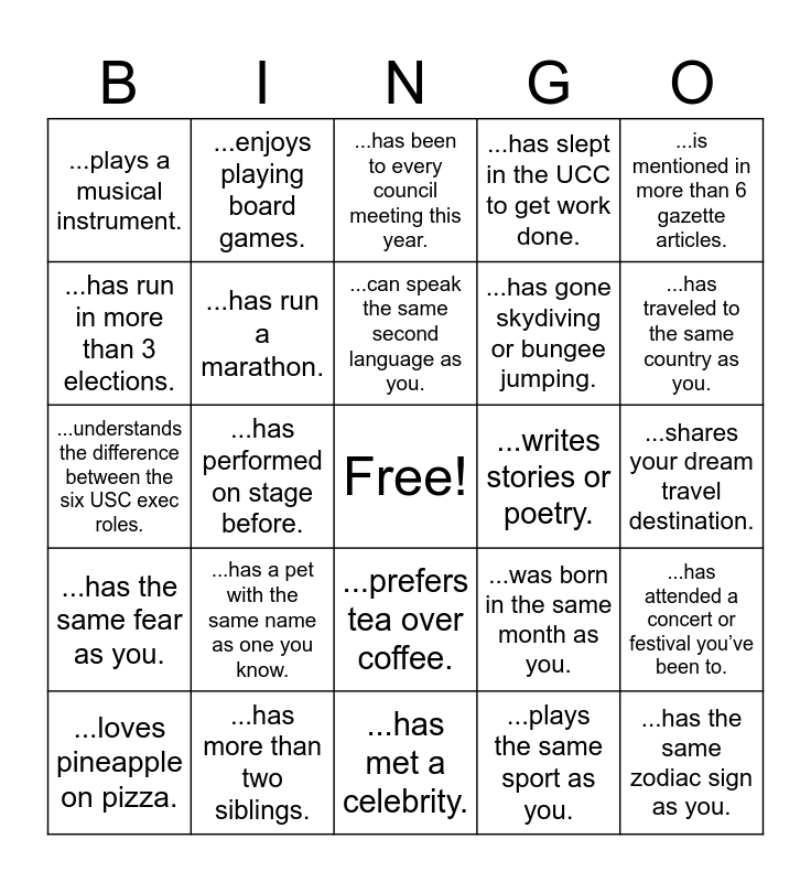 This bingo card has a free space and 30 words: ...has more than two siblings., ...shares your favorite music genre., ...has performed on stage before., ...likes hiking or outdoor adventures., ...plays a musical instrument., ...has been to every council meeting this year., ...has run a marathon., ...prefers tea over coffee., ...writes stories or poetry., ...has met a celebrity., ...shares your dream travel destination., ...has the same zodiac sign as you., ...plays the same sport as you., ...has the same favourite movie as you., ...has traveled to the same country as you., ...is good at drawing or painting., ...was born in the same month as you., ...has the same fear as you., ...has a pet with the same name as one you know., ...is mentioned in more than 6 gazette articles., ...understands the difference between the six USC exec roles., ...is left-handed., ...enjoys playing board games., ...has gone skydiving or bungee jumping., ...has run in more than 3 elections., ...has slept in the UCC to get work done., ...has attended a concert or festival you’ve been to., ...loves pineapple on pizza., ...can speak the same second language as you. and ...has the same favorite color as you..