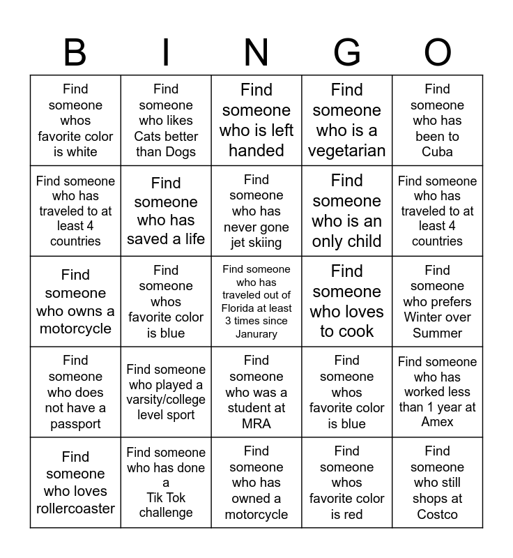 This bingo card has a free space and 48 words: Find someone who has worked for Amex more than 15 years, Find someone who still shops at Costco, Find someone who has broken at least 1 bone in their body, Find someone who has owned a motorcycle, Find someone who played a varsity/college level sport, Find someone who watches Game of Thrones, Find someone who likes Cats better than Dogs, Find someone who does not have a passport, Find someone who has traveled to at least 4 countries, Find someone who has 5 or more siblings, Find someone who has saved a life, Find someone who is a vegetarian, Find someone who has worked less than 1 year at Amex, Find someone whos favorite color is blue, Find someone whos favorite color is green, Find someone whos first job was a Fast Food restaurant, Find someone who has never gone jet skiing, Find someone who loves to cook, Find someone who admits to having terrible handwriting, Find someone who has been to Cuba, Find someone whos favorite color is blue, Find someone whos favorite color is red, Find someone whos favorite color is white, Find someone who is an only child, Find someone who has never gone skiing, Find someone who has traveled to at least 4 countries, Find someone who loves rollercoaster, Find someone who had been at MRA for 5+ years, Find someone who was a student at MRA, Find someone who does not have a passport, Find someone who watches reality TV, Find someone who has never been to Disneyland, Find someone whos favorite color is green, Find someone who has lived in California their whole life., Find someone who has done a Tik Tok challenge, FREE, Find someone who is afraid of heights, Find someone who prefers Winter over Summer, Find someone whose first job was fast food, Find someone that speaks 2 languages, Find someone who has broken at least one bone in their body, Find someone who this is their first year at MRA, Find someone who is left handed, Find someone who shops at Costco, Find someone who owns a motorcycle, Find someone who has birthday is this month, Find someone who loves to cook and Find someone who has more than 5 siblings.