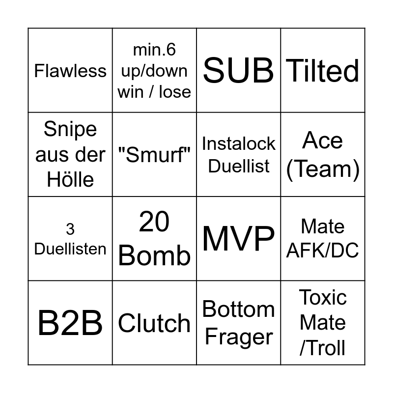 This bingo card has 16 words: Clutch, Mate AFK/DC, SUB, Flawless, 3 Duellisten, min.6 up/down win / lose, MVP, Bottom Frager, Snipe aus der Hölle, "Smurf", B2B, Tilted, 20 Bomb, Ace (Team), Instalock Duellist and Toxic Mate /Troll.
