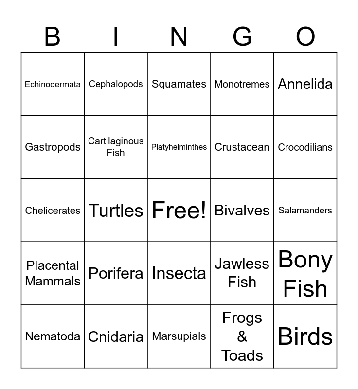 This bingo card has a free space and 24 words: Porifera, Cnidaria, Platyhelminthes, Nematoda, Annelida, Echinodermata, Gastropods, Cephalopods, Bivalves, Insecta, Crustacean, Chelicerates, Jawless Fish, Bony Fish, Cartilaginous Fish, Frogs & Toads, Salamanders, Squamates, Crocodilians, Turtles, Birds, Placental Mammals, Monotremes and Marsupials.