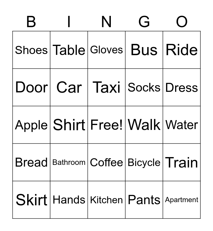 This bingo card has a free space and 51 words: House, Apartment, Room, Kitchen, Bathroom, Bed, Table, Chair, Door, Window, Car, Bus, Train, Bicycle, Airplane, Boat, Taxi, Walk, Drive, Ride, Shirt, Pants, Shoes, Socks, Jacket, Hat, Dress, Sweater, Skirt, Gloves, Head, Eyes, Nose, Mouth, Ears, Hands, Feet, Legs, Arms, Fingers, Water, Bread, Rice, Meat, Fruit, Vegetables, Apple, Milk, Juice, Coffee and Tea.