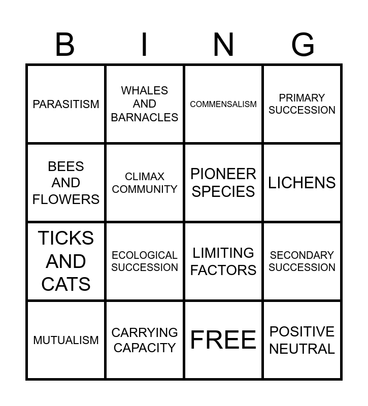 This bingo card has 17 words: FREE, MUTUALISM, COMMENSALISM, PARASITISM, ECOLOGICAL SUCCESSION, PRIMARY SUCCESSION, SECONDARY SUCCESSION, PIONEER SPECIES, LICHENS, CLIMAX COMMUNITY, CARRYING CAPACITY, LIMITING FACTORS, BEES AND FLOWERS, WHALES AND BARNACLES, TICKS AND CATS, POSITIVE NEGATIVE and POSITIVE NEUTRAL.