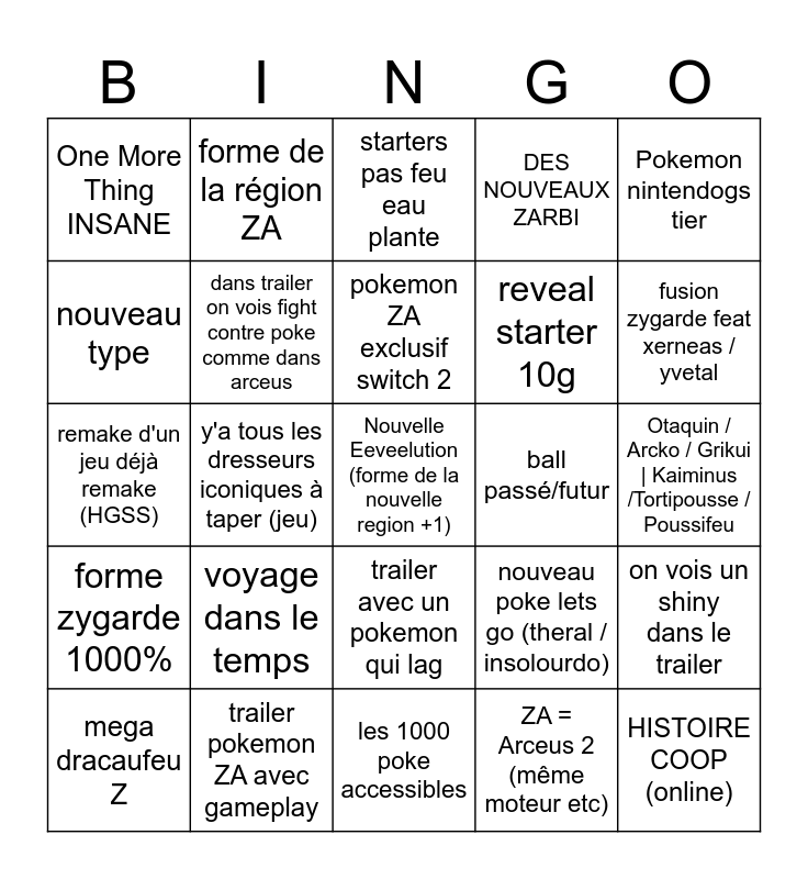 This bingo card has a free space and 24 words: voyage dans le temps, trailer pokemon ZA avec gameplay, pokemon ZA exclusif switch 2, mega dracaufeu Z, Pokemon nintendogs tier, One More Thing INSANE, nouveau type, forme de la région ZA, ball passé/futur, trailer avec un pokemon qui lag, reveal starter 10g, remake d'un jeu déjà remake (HGSS), nouveau poke lets go (theral / insolourdo), on vois un shiny dans le trailer, dans trailer on vois fight contre poke comme dans arceus, ZA = Arceus 2 (même moteur etc), Otaquin / Arcko / Grikui | Kaiminus /Tortipousse / Poussifeu, starters pas feu eau plante, fusion zygarde feat xerneas / yvetal, y'a tous les dresseurs iconiques à taper (jeu), HISTOIRE COOP (online), forme zygarde 1000%, DES NOUVEAUX ZARBI and les 1000 poke accessibles.