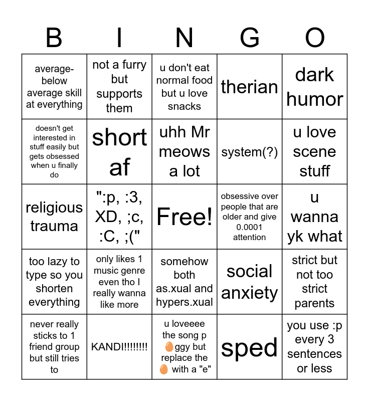 This bingo card has a free space and 24 words: only likes 1 music genre even tho I really wanna like more, KANDI!!!!!!!!, uhh Mr meows a lot, never really sticks to 1 friend group but still tries to, dark humor, average-below average skill at everything, doesn't get interested in stuff easily but gets obsessed when u finally do, not a furry but supports them, obsessive over people that are older and give 0.0001 attention, somehow both as.xual and hypers.xual, system(?), religious trauma, social anxiety, strict but not too strict parents, short af, sped, u wanna yk what, u don't eat normal food but u love snacks, u love scene stuff, ":p, :3, XD, ;c, :C, ;(", you use :p every 3 sentences or less, too lazy to type so you shorten everything, therian and u loveeee the song p🥚ggy but replace the 🥚 with a "e".