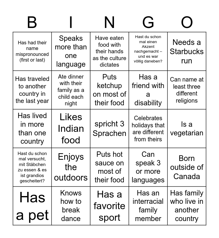 This bingo card has a free space and 28 words: Born outside of Canada, Has attended a religious ceremony in a church/temple/ mosque other than their own, Has a friend with a disability, Has an interracial family member, Has traveled to another country in the last year, Have eaten food with their hands as the culture dictates, Speaks more than one language, Hast du schon mal versucht, mit Stäbchen zu essen & es ist grandios gescheitert?, Celebrates holidays that are different from theirs, Has a pet, Has lived in more than one country, Hast du schon mal einen Akzent nachgemacht – und es war völlig daneben?, Knows how to break dance, Has a favorite sport, Can name at least three different religions, Has had more than 2 jobs in their career, Enjoys the outdoors, Ate dinner with their family as a child each night, Puts ketchup on most of their food, Puts hot sauce on most of their food, Has had their name mispronounced (first or last), Has tried food from at least three different countries, Has family who live in another country, Likes Indian food, Is a vegetarian, Can speak 3 or more languages, Needs a Starbucks run and Rode on the bus to get to school as a child.