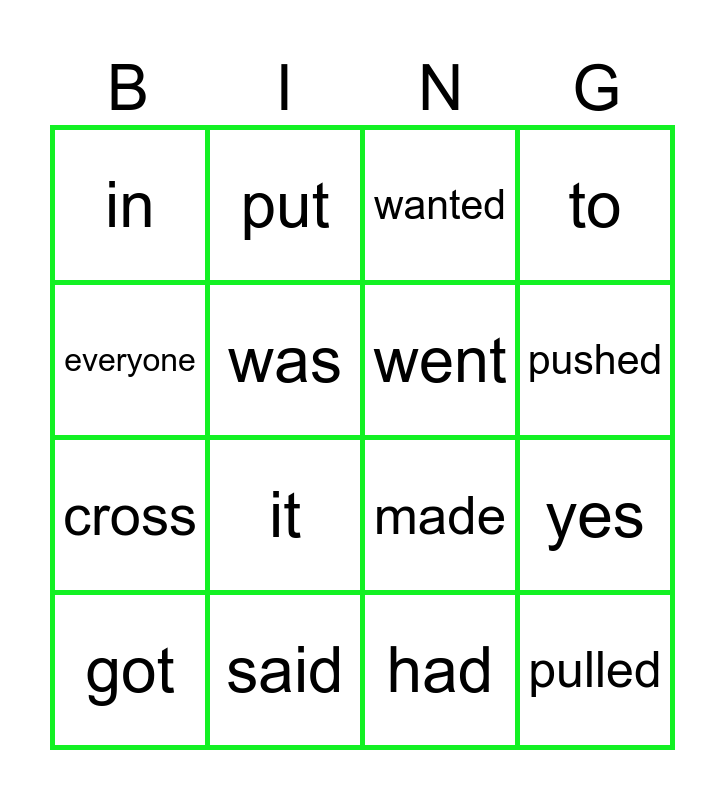 This bingo card has 18 words: it, pulled, wanted, in, made, to, got, put, pushed, cross, had, everyone, yes, was, went, you, said and they.