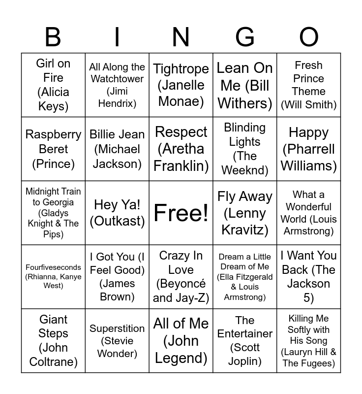 This bingo card has a free space and 26 words: Crazy In Love (Beyoncé and Jay-Z), The Entertainer (Scott Joplin), Respect (Aretha Franklin), Superstition (Stevie Wonder), Fresh Prince Theme (Will Smith), Girl on Fire (Alicia Keys), Raspberry Beret (Prince), All Along the Watchtower (Jimi Hendrix), What a Wonderful World (Louis Armstrong), Dream a Little Dream of Me (Ella Fitzgerald & Louis Armstrong), Blinding Lights (The Weeknd), Midnight Train to Georgia (Gladys Knight & The Pips), I Want You Back (The Jackson 5), Giant Steps (John Coltrane), Hey Ya! (Outkast), Three Little Birds (Bob Marley), Lean On Me (Bill Withers), Fourfiveseconds (Rhianna, Kanye West), Tightrope (Janelle Monae), Killing Me Softly with His Song (Lauryn Hill & The Fugees), Happy (Pharrell Williams), All of Me (John Legend), Fly Away (Lenny Kravitz), I Got You (I Feel Good) (James Brown), Billie Jean (Michael Jackson) and DJ Got Us Fallin' In Love (Usher & Pitbull).