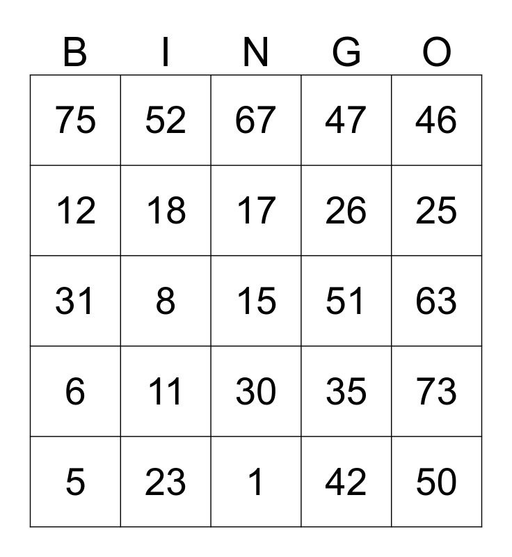 This bingo card has a free space and 24 words: 11, 23, 17, 5, 46, 75, 12, 52, 51, 30, 26, 31, 35, 73, 18, 42, 63, 67, 25, 8, 50, 6, 47 and 1.