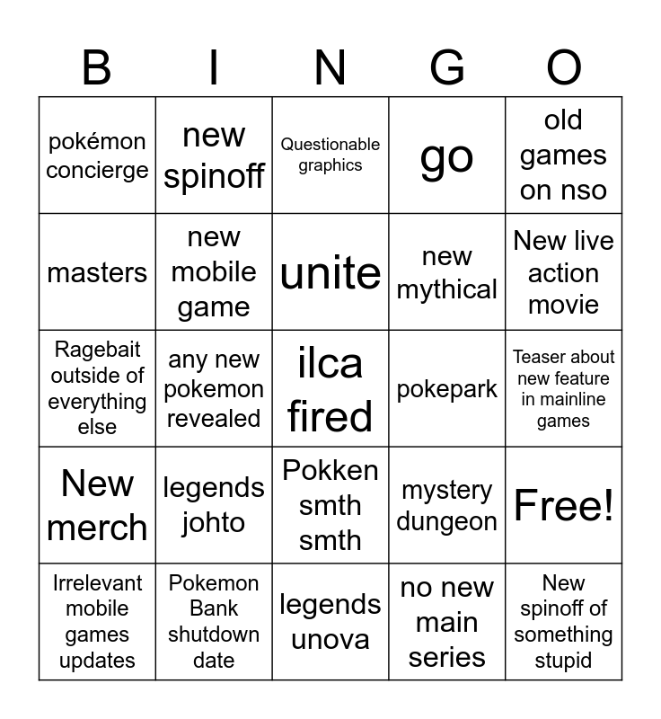 This bingo card has 50 words: johto remakes, ilca fired, unova remakes, legends unova, legends johto, let's go johto, new spinoff, sv dlc 3, masters, cafe remix, new mobile game, go, Free!, mystery dungeon, spinoff remake, sleep, unite, pokepark, stadium, old games on nso, any new pokemon revealed, no new main series, pokémon concierge, new mythical, entirely new main series concept, New spinoff of something stupid, New live action movie, Stupid new mobile thing, Questionable graphics, Pokken smth smth, Mega reveal, Starters reveal, NSO GBA games, Pokemon GO new feature, Pokemon Bank shutdown date, New anime arc, We apologize (FREE!), New pokemon unite pokemon, New PTCGP pack, Teaser about new feature in mainline games, Gen 10 Teaser, Remake of something, Pokemon center locations, New Eeveelution, Irrelevant mobile games updates, Ragebait outside of everything else, New let's go, Flashy new move that's completely irrelvant, New merch and Pokemon theme park (believe).