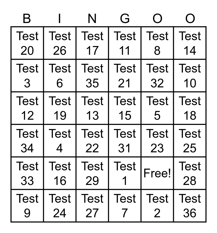 This bingo card has 37 words: Free!, Test 1, Test 2, Test 3, Test 4, Test 5, Test 6, Test 7, Test 8, Test 9, Test 10, Test 11, Test 12, Test 13, Test 14, Test 15, Test 16, Test 17, Test 18, Test 19, Test 20, Test 21, Test 22, Test 23, Test 24, Test 25, Test 26, Test 27, Test 28, Test 29, Test 30, Test 31, Test 32, Test 33, Test 34, Test 35 and Test 36.