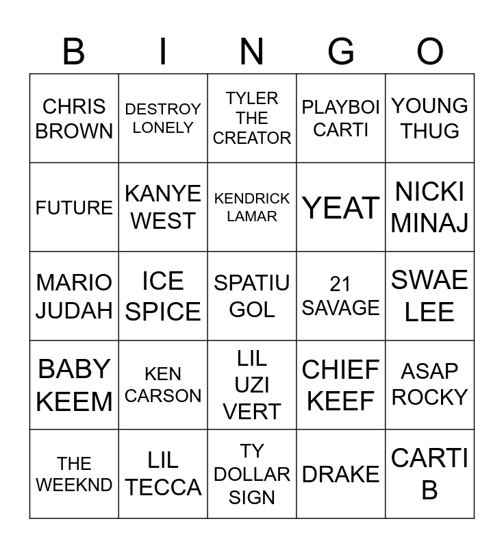 This bingo card has a free space and 24 words: KEN CARSON, LIL TECCA, KENDRICK LAMAR, THE WEEKND, YOUNG THUG, CHRIS BROWN, FUTURE, DESTROY LONELY, 21 SAVAGE, LIL UZI VERT, YEAT, MARIO JUDAH, CHIEF KEEF, ASAP ROCKY, KANYE WEST, DRAKE, SWAE LEE, TYLER THE CREATOR, NICKI MINAJ, ICE SPICE, CARTI B, BABY KEEM, PLAYBOI CARTI and TY DOLLAR SIGN.