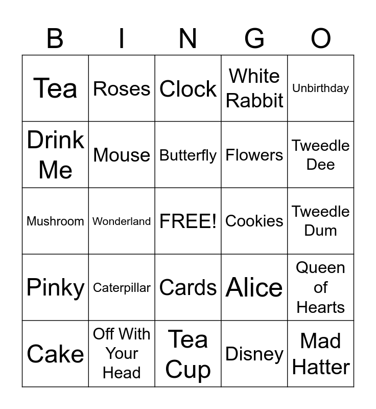 This bingo card has a free space and 24 words: Caterpillar, Off With Your Head, Butterfly, Cake, Unbirthday, Tea, Drink Me, Roses, Cookies, Cards, Flowers, Mushroom, Alice, Queen of Hearts, Mouse, Disney, Tweedle Dum, Clock, Tweedle Dee, Wonderland, Mad Hatter, Pinky, White Rabbit and Tea Cup.
