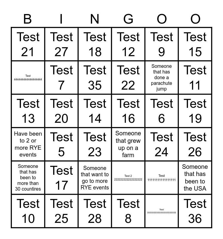 This bingo card has 37 words: Test 11111111111111111, Test 2 222222222222222222, Test 3333333333333333333333, Test 444444444444444444, Test 5, Test 6, Test 7, Test 8, Test 9, Test 10, Test 11, Test 12, Test 13, Test 14, Test 15, Test 16, Test 17, Test 18, Test 19, Test 20, Test 21, Test 22, Test 23, Test 24, Test 25, Test 26, Test 27, Test 28, Someone that has been to the USA, Someone that want to go to more RYE events, Someone that has been swimming in the sea in 2025, Someone that grew up on a farm, Someone that has done a parachute jump, Someone that has been to more than 30 countires, Have been to 2 or more RYE events, Test 35 and Test 36.