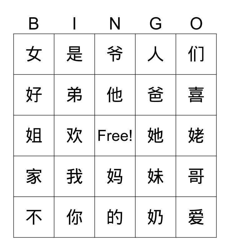 This bingo card has a free space and 24 words: 我, 你, 他, 不, 们, 女, 好, 是, 她, 妈, 爸, 姐, 妹, 哥, 弟, 奶, 姥, 爷, 喜, 欢, 爱, 家, 人 and 的.