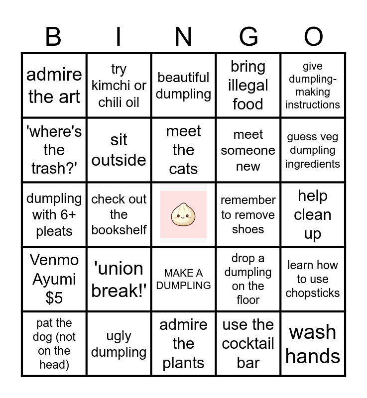 This bingo card has a free space and 24 words: 'union break!', ugly dumpling, meet the cats, pat the dog (not on the head), give dumpling-making instructions, admire the art, 'where's the trash?', try kimchi or chili oil, remember to remove shoes, MAKE A DUMPLING, meet someone new, dumpling with 6+ pleats, drop a dumpling on the floor, learn how to use chopsticks, sit outside, use the cocktail bar, help clean up, beautiful dumpling, guess veg dumpling ingredients, check out the bookshelf, wash hands, Venmo Ayumi $5, bring illegal food and admire the plants.