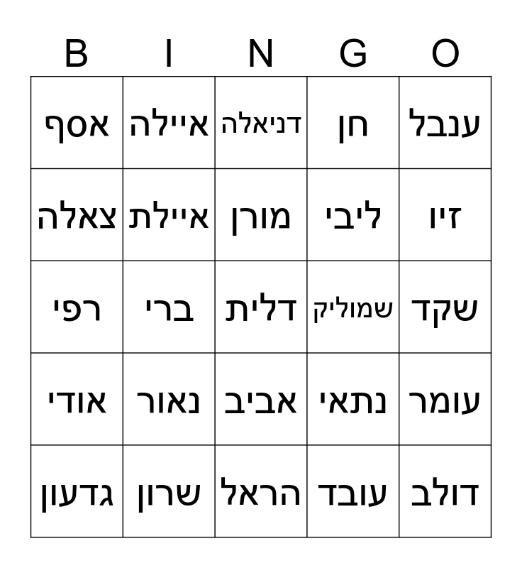 This bingo card has 56 words: ארזה, גדעון, גלי. ג, אסף, הראל, מאיה.ג, איילת, אייל, ליבי, הילל, חן, יואב, עומרי, ארז, נעמה, אמוץ, ענבל, ברי, אולי, דלית, שמוליק, עיטם, נתאי, דניאלה, עדו, מורן, שני, ליאור, זיו, ניצן, יהב, יעל, עדי, ניר, שקד, צאלה, רפי, הדר, אודי, איילה, אביב, דולב, רהב, מעיין, פלג, נאור, שרון, אוריין, נתנאל, זהבה, עובד, ניב, מיה. א, גלי. נ, עומר and רז.