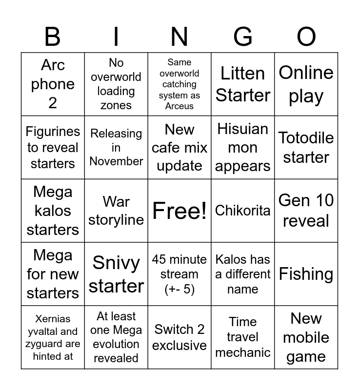 This bingo card has a free space and 24 words: Snivy starter, At least one Mega evolution revealed, New cafe mix update, Xernias yvaltal and zyguard are hinted at, Online play, Arc phone 2, Figurines to reveal starters, No overworld loading zones, Chikorita, 45 minute stream (+- 5), Hisuian mon appears, Mega kalos starters, Kalos has a different name, Fishing, Releasing in November, Time travel mechanic, Gen 10 reveal, Same overworld catching system as Arceus, Totodile starter, War storyline, New mobile game, Mega for new starters, Litten Starter and Switch 2 exclusive.