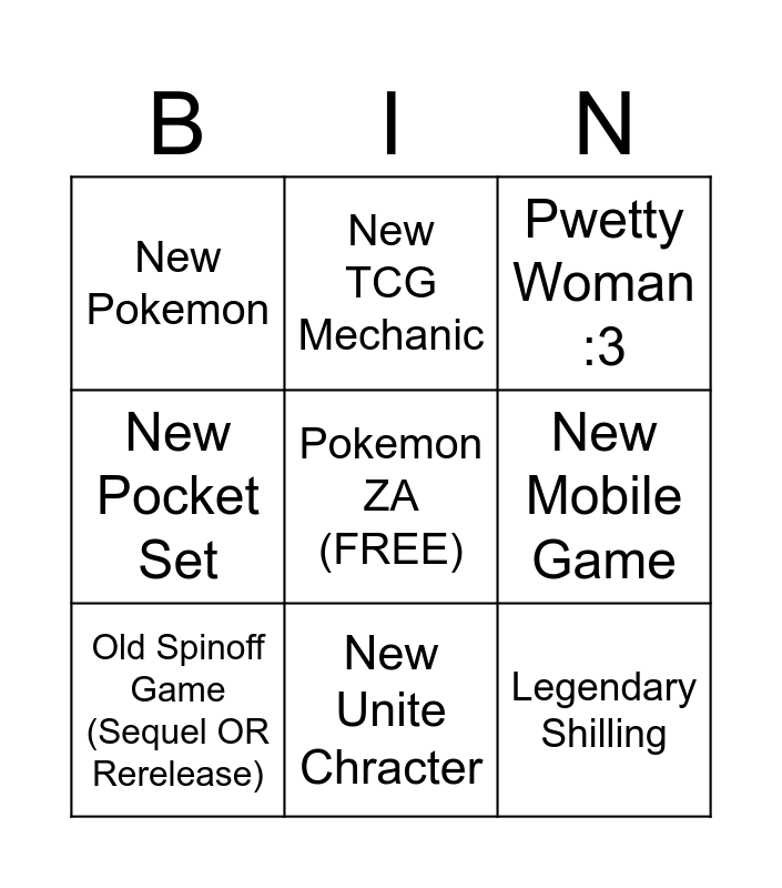 This bingo card has a free space and 8 words: New Pocket Set, New TCG Mechanic, New Mobile Game, Old Spinoff Game (Sequel OR Rerelease), Pwetty Woman :3, New Pokemon, New Unite Chracter and Legendary Shilling.