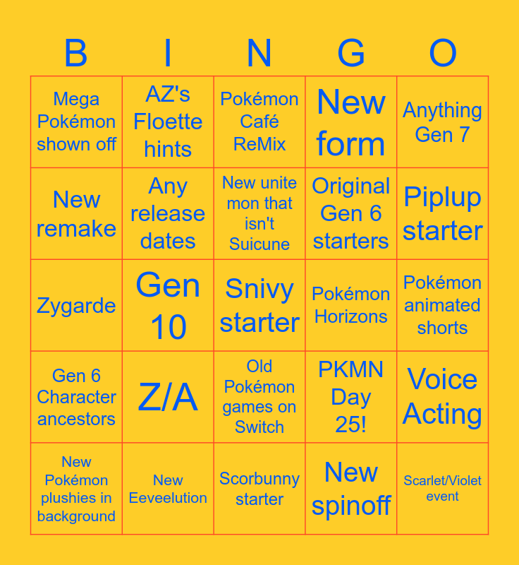 This bingo card has 25 words: Z/A, Scorbunny starter, New unite mon that isn't Suicune, New Pokémon plushies in background, Anything Gen 7, Mega Pokémon shown off, New remake, AZ's Floette hints, Pokémon Horizons, Old Pokémon games on Switch, Original Gen 6 starters, Zygarde, PKMN Day 25!, Voice Acting, Any release dates, Scarlet/Violet event, Pokémon animated shorts, Pokémon Café ReMix, Piplup starter, Gen 10, Snivy starter, New Eeveelution, Gen 6 Character ancestors, New form and New spinoff.