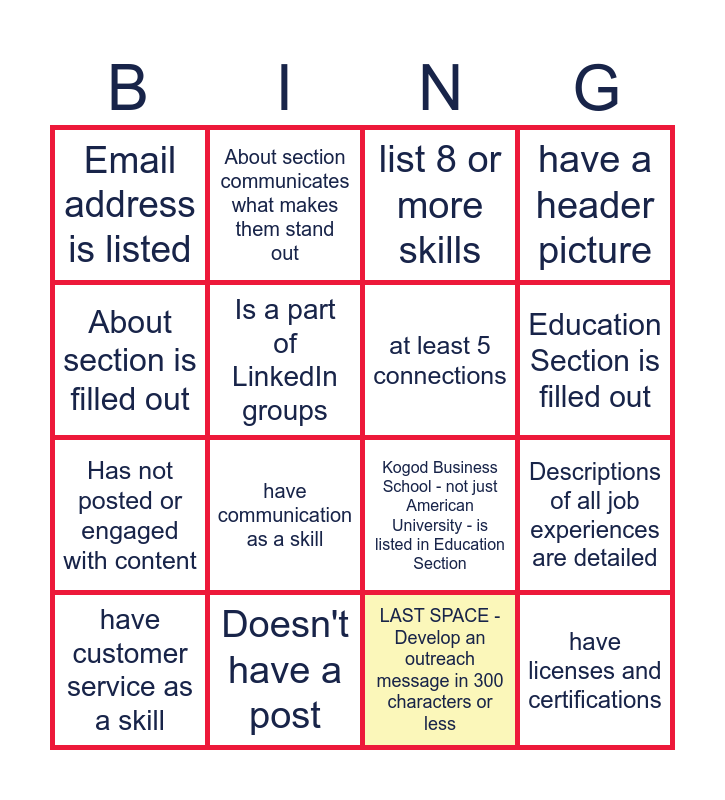 This bingo card has 26 words: No Profile Picture, 5 or more skills are listed and endorsed, Education Section is filled out, About section communicates their core values, About section is filled out, Email address is listed, Is a part of LinkedIn groups, About section communicates what makes them stand out, LAST SPACE - Develop an outreach message in 300 characters or less, "Follows" relevant or companies of interest, Has not posted or engaged with content, Kogod Business School - not just American University - is listed in Education Section, Listed skills relevant to career goals, Connected with all 3 Kogod Undergrad Coaches, Descriptions of all job experiences are detailed, Connected with Kogod Career Development LinkedIn Page, have a header picture, have licenses and certifications, list 8 or more skills, have customer service as a skill, have communication as a skill, at least 10 connections, Doesn't have a post, filled out the job preferences questioner, at least 5 connections and have a custom linkedin url.