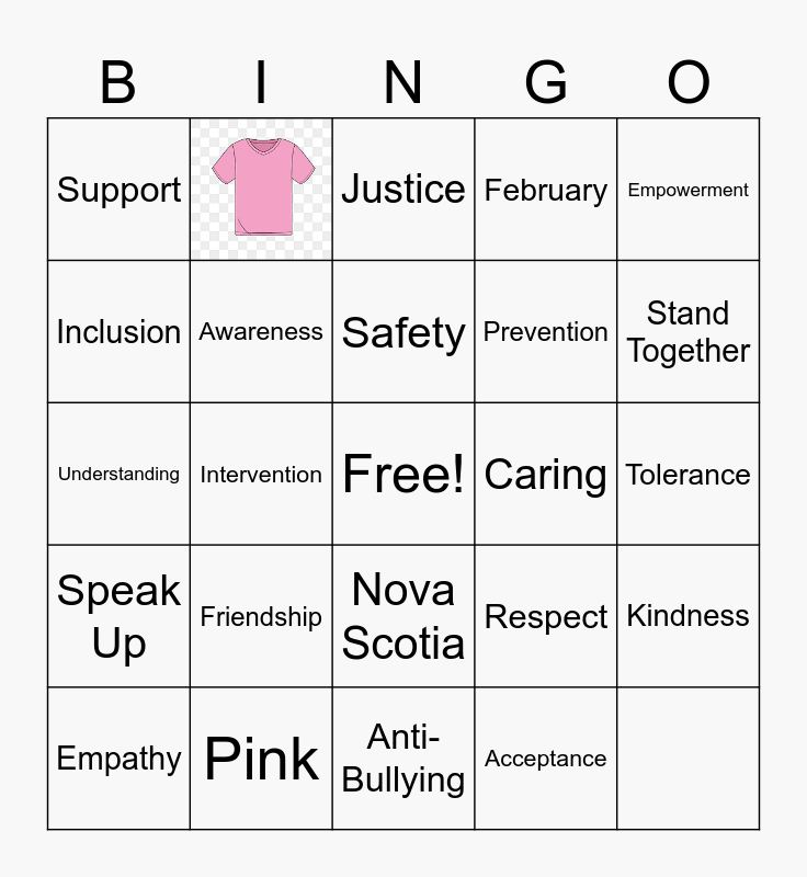This bingo card has 2 images, a free space and 22 words: Empathy, Friendship, Safety, Acceptance, Empowerment, Support, Awareness, Justice, Prevention, Tolerance, Understanding, Intervention, Respect, Kindness, Inclusion, Pink, Nova Scotia, February, Stand Together, Speak Up, Anti-Bullying and Caring.