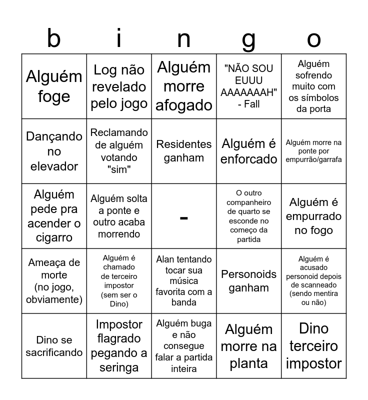 This bingo card has a free space and 45 words: Alguém morre no portão, Dino terceiro impostor, Dino acusando o alan, Dino se sacrificando, Alguém reclamando do microfone do Vx ou Fall, Alguém morre na planta, Alguém morre afogado, Alguém morre congelado, Alguém sofrendo muito com os símbolos da porta, Impostor flagrado pegando a seringa, "NÃO SOU EUUU AAAAAAAH" - Fall, O outro companheiro de quarto se esconde no começo da partida, Alan tentando tocar sua música favorita com a banda, Alguém é chamado de terceiro impostor (sem ser o Dino), Alguém crasha, Alguém buga e não consegue falar a partida inteira, "Fulano não falou o log" / "Por que não falou o log?", Alguém pede pra acender o cigarro, Alguém morre pelo fogo, Alguém morre na ponte por empurrão/garrafa, Log não revelado pelo jogo, "Quem/Por que fulano votou em mim???", "Por que fulano votou no ciclano???", Alguém foge, Alguém pega fogo sozinho, Alguém é empurrado no fogo, Alguém cai na piscina, Alguém xinga o outro por ser incompetente nos puzzles, Personoids ganham, Ameaça de morte (no jogo, obviamente), Alguém é agarrado por trás libidinosamente, Alguém é acusado personoid depois de scanneado (sendo mentira ou não), Alguém morre pelo lustre, Alguém derruba o lustre mas ninguém morre, "Fulano sumiu" / Alguém sendo acusado depois de sumir, Alguém solta a ponte e outro acaba morrendo, Morte por seringada, Alguém solta a porta e o outro é ejetado, Dançando no jukebox, Residentes ganham, Dançando no elevador, Alguém é enforcado, Alguém reclamando como o outro descreveu o símbolo da porta, Reclamando de alguém votando "sim" and "Fulano tá quieto".