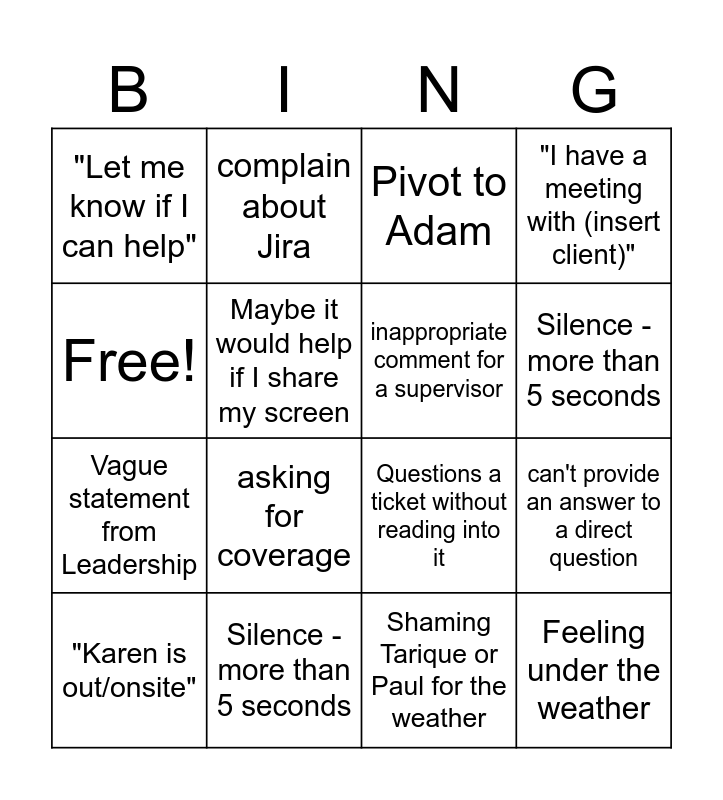 This bingo card has 16 words: Silence - more than 5 seconds, can't provide an answer to a direct question, Pivot to Adam, "Let me know if I can help", Vague statement from Leadership, complain about Jira, Questions a ticket without reading into it, Shaming Tarique or Paul for the weather, Free!, Maybe it would help if I share my screen, "Karen is out/onsite", "I have a meeting with (insert client)", asking for coverage, Silence - more than 5 seconds, inappropriate comment for a supervisor and Feeling under the weather.