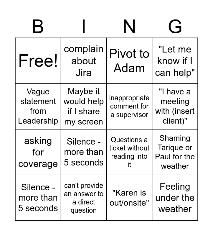 This bingo card has 16 words: Silence - more than 5 seconds, can't provide an answer to a direct question, Pivot to Adam, "Let me know if I can help", Vague statement from Leadership, complain about Jira, Questions a ticket without reading into it, Shaming Tarique or Paul for the weather, Free!, Maybe it would help if I share my screen, "Karen is out/onsite", "I have a meeting with (insert client)", asking for coverage, Silence - more than 5 seconds, inappropriate comment for a supervisor and Feeling under the weather.