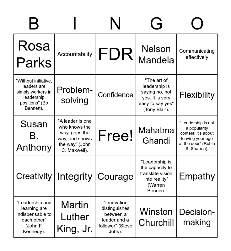 This bingo card has a free space and 24 words: Integrity, Martin Luther King, Jr., Confidence, "Leadership and learning are indispensable to each other" (John F. Kennedy)., Communicating effectively, Rosa Parks, "Without initiative, leaders are simply workers in leadership positions" (Bo Bennett)., Accountability, Mahatma Ghandi, Courage, "The art of leadership is saying no, not yes. It is very easy to say yes" (Tony Blair)., Susan B. Anthony, "Leadership is the capacity to translate vision into reality" (Warren Bennis)., Empathy, Problem-solving, Winston Churchill, "Leadership is not a popularity contest; it's about leaving your ego at the door" (Robin S. Sharma)., FDR, Flexibility, "A leader is one who knows the way, goes the way, and shows the way" (John C. Maxwell)., Decision-making, Creativity, Nelson Mandela and "Innovation distinguishes between a leader and a follower" (Steve Jobs)..