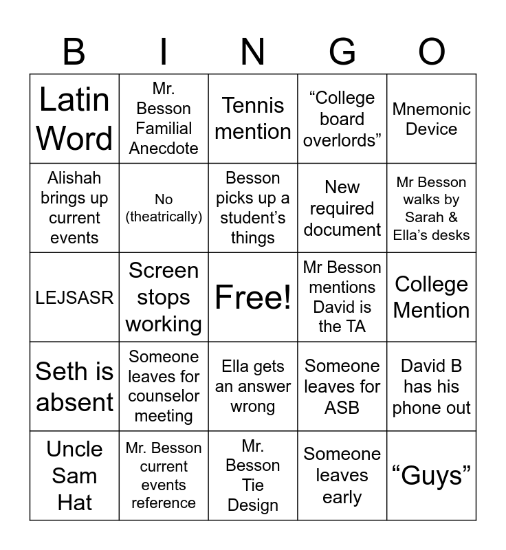 This bingo card has a free space and 33 words: Someone says something politically incorrect, “Remember this from APUSH”/”We learned this in APUSH”, Screen stops working, Clap once, clap twice, Seth is absent, No (theatrically), Mnemonic Device, Uncle Sam Hat, Mr. Besson Familial Anecdote, Computers closed, Besson picks up a student’s things, Tennis mention, Jesse over explains random fact/answer, David B mentions he’s a TA, Mr Besson mentions David is the TA, Mr Besson walks by Sarah & Ella’s desks, Mr. Besson current events reference, LEJSASR, Someone leaves for counselor meeting, Someone leaves for ASB, Ella gets an answer wrong, Purse, Sword, Gavel, Latin Word, College Mention, Mr. Besson Tie Design, “Guys”, “College board overlords”, New required document, Alishah brings up current events, David B has his phone out, Court case mention, Someone leaves early and Sarah Participates.