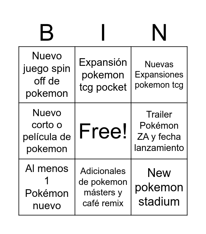 This bingo card has a free space and 8 words: Trailer Pokémon ZA y fecha lanzamiento, Nuevas Expansiones pokemon tcg, Expansión pokemon tcg pocket, Al menos 1 Pokémon nuevo, Nuevo juego spin off de pokemon, New pokemon stadium, Nuevo corto o película de pokemon and Adicionales de pokemon másters y café remix.