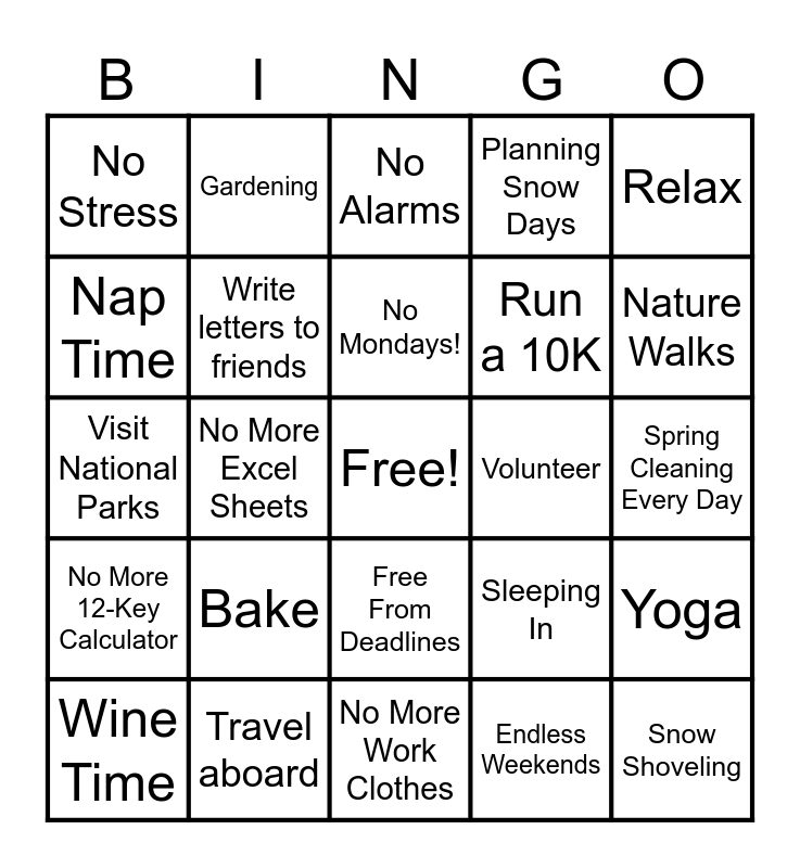 This bingo card has a free space and 24 words: Bake, Travel aboard, No Mondays!, Wine Time, Relax, No Stress, Nap Time, Gardening, Volunteer, Free From Deadlines, Run a 10K, Visit National Parks, Sleeping In, Yoga, Write letters to friends, Endless Weekends, Spring Cleaning Every Day, No Alarms, Nature Walks, No More Excel Sheets, Snow Shoveling, No More 12-Key Calculator, Planning Snow Days and No More Work Clothes.