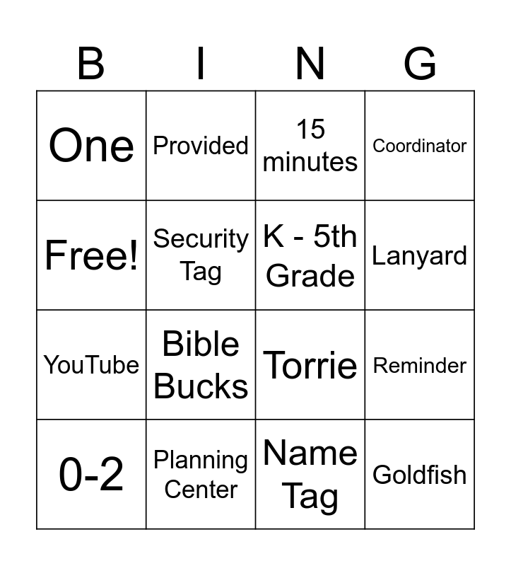 This bingo card has 16 words: Planning Center, Reminder, 15 minutes, One, YouTube, Provided, Torrie, Name Tag, Free!, Security Tag, 0-2, Coordinator, Bible Bucks, Lanyard, K - 5th Grade and Goldfish.