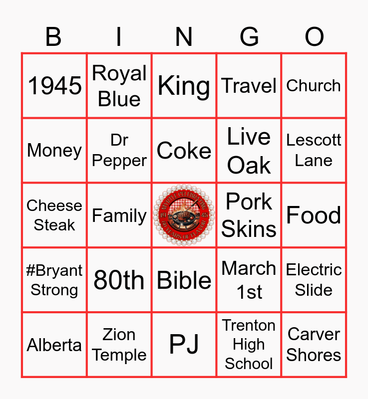 This bingo card has a free space and 24 words: 80th, Zion Temple, Coke, Alberta, Church, 1945, Money, Royal Blue, Pork Skins, Bible, Live Oak, Cheese Steak, March 1st, Electric Slide, Dr Pepper, Trenton High School, Food, King, Lescott Lane, Family, Carver Shores, #Bryant Strong, Travel and PJ.