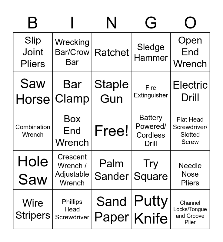 This bingo card has a free space and 58 words: Tape Measure, Phillips Head Screwdriver, 12 Point Socket, Hole Saw, Putty Knife, Bubble Level, Bar Clamp, Orbital Sander, Fire Extinguisher, Jigsaw, Sledge Hammer, Plumb Bob, Framing Square, Compound Miter Saw, Speed Square, Slip Joint Pliers, Channel Locks/Tongue and Groove Plier, Open End Wrench, Twist Bit, Staple Gun, Battery Powered/ Cordless Drill, Ratchet, Wire Stripers, Needle Nose Pliers, Screw, Flat Head Screwdriver/ Slotted Screw, Torx Head, Impact Drill, Electric Drill, CounterSink Bit, Nail, Claw Hammer, Ball Peen Hammer, Rubber Mallet, Bolt, Nut, Washer, Box End Wrench, Combination Wrench, 6 Point Socket, Crescent Wrench / Adjustable Wrench, Combination Square, Try Square, Sliding T Bevel, Chalk Line, Table Saw, Drill Press, Palm Sander, Sand Paper, Extension Cord, Cord Reel, Wood Chisel, Carpenter’s Pencil, Vice Grip / Locking Pliers, Wrecking Bar/Crow Bar, Hex Key/Allen Wrench, Saw Horse and Utility Knife.