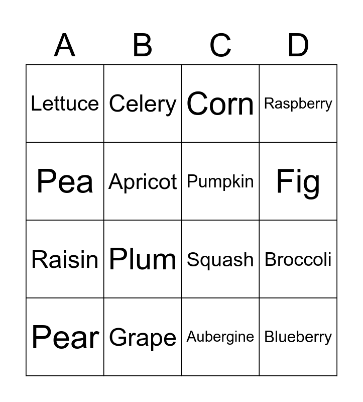This bingo card has 16 words: Grape, Broccoli, Corn, Lettuce, Raisin, Celery, Squash, Aubergine, Pea, Apricot, Pear, Raspberry, Plum, Fig, Pumpkin and Blueberry.