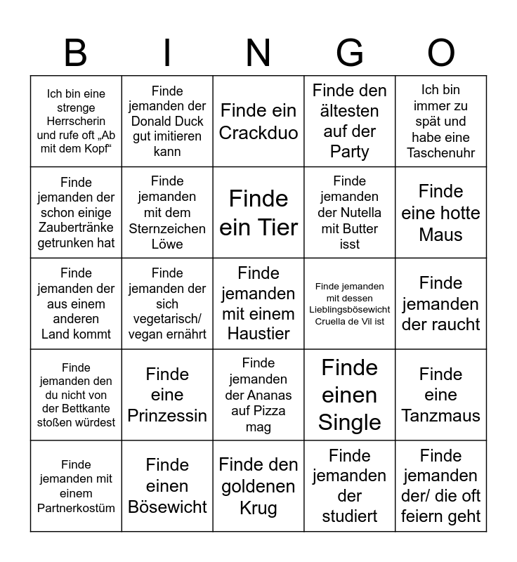 This bingo card has a free space and 24 words: Finde eine Prinzessin, Finde einen Bösewicht, Finde ein Tier, Finde jemanden mit einem Partnerkostüm, Ich bin immer zu spät und habe eine Taschenuhr, Ich bin eine strenge Herrscherin und rufe oft „Ab mit dem Kopf“, Finde jemanden der schon einige Zaubertränke getrunken hat, Finde jemanden der Donald Duck gut imitieren kann, Finde jemanden mit dessen Lieblingsbösewicht Cruella de Vil ist, Finde jemanden der Ananas auf Pizza mag, Finde jemanden der Nutella mit Butter isst, Finde jemanden der aus einem anderen Land kommt, Finde einen Single, Finde eine Tanzmaus, Finde jemanden mit dem Sternzeichen Löwe, Finde jemanden der studiert, Finde jemanden der raucht, Finde ein Crackduo, Finde eine hotte Maus, Finde jemanden der sich vegetarisch/ vegan ernährt, Finde jemanden der/ die oft feiern geht, Finde jemanden den du nicht von der Bettkante stoßen würdest, Finde den ältesten auf der Party and Finde den goldenen Krug.