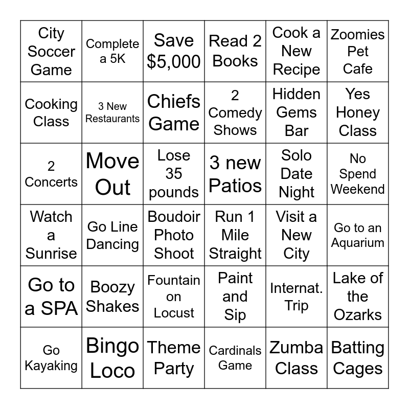 This bingo card has 36 words: Paint and Sip, Fountain on Locust, Cardinals Game, Cooking Class, Watch a Sunrise, 3 new Patios, 3 New Restaurants, Theme Party, Cook a New Recipe, Internat. Trip, Yes Honey Class, Read 2 Books, Lake of the Ozarks, Move Out, 2 Comedy Shows, City Soccer Game, Go to a SPA, Solo Date Night, 2 Concerts, Save $5,000, Lose 35 pounds, Go Line Dancing, Run 1 Mile Straight, Boudoir Photo Shoot, Visit a New City, Complete a 5K, Hidden Gems Bar, Bingo Loco, Chiefs Game, Zoomies Pet Cafe, Batting Cages, Go Kayaking, Go to an Aquarium, No Spend Weekend, Boozy Shakes and Zumba Class.