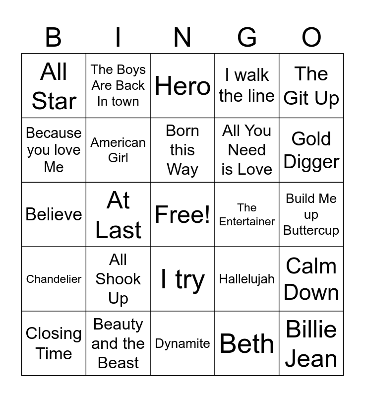 This bingo card has a free space and 24 words: All Shook Up, Beauty and the Beast, Born this Way, Closing Time, The Git Up, All Star, Because you love Me, The Boys Are Back In town, The Entertainer, I try, All You Need is Love, Believe, Hallelujah, Calm Down, American Girl, Beth, Build Me up Buttercup, Hero, Gold Digger, At Last, Billie Jean, Chandelier, I walk the line and Dynamite.