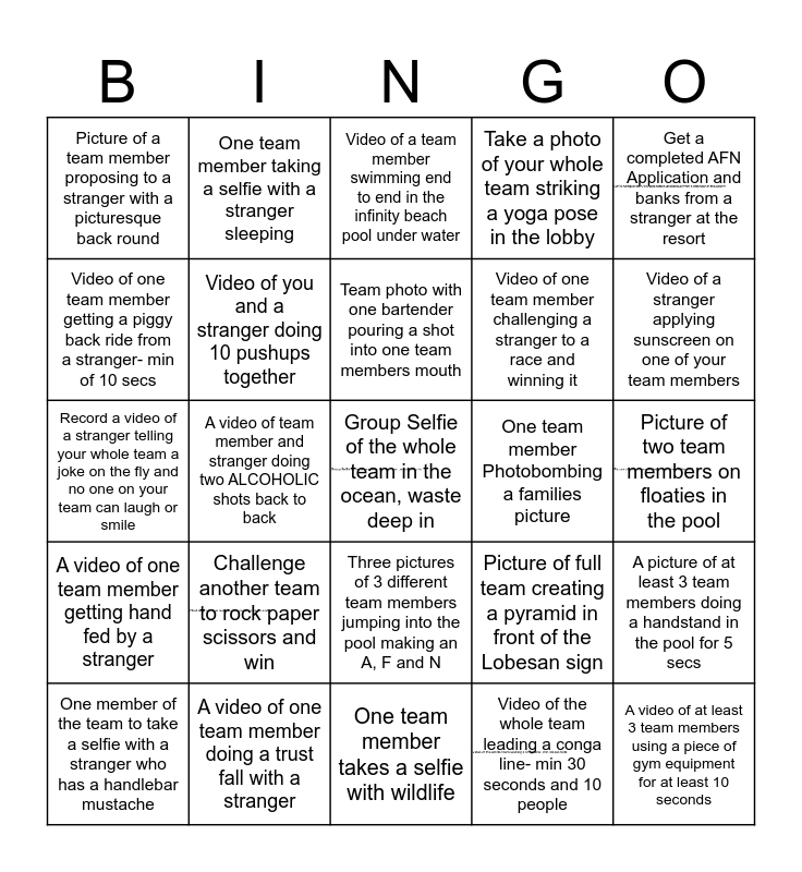 This bingo card has 5 images and 25 words: Challenge another team to rock paper scissors and win, One team member takes a selfie with wildlife, Team photo with one bartender pouring a shot into one team members mouth, One member of the team to take a selfie with a stranger who has a handlebar mustache, Get a completed AFN Application and banks from a stranger at the resort, Picture of a team member proposing to a stranger with a picturesque back round, Video of one team member getting a piggy back ride from a stranger- min of 10 secs, One team member taking a selfie with a stranger sleeping, One team member Photobombing a families picture, Three pictures of 3 different team members jumping into the pool making an A, F and N, Video of one team member challenging a stranger to a race and winning it, Record a video of a stranger telling your whole team a joke on the fly and no one on your team can laugh or smile, Picture of full team creating a pyramid in front of the Lobesan sign, A picture of at least 3 team members doing a handstand in the pool for 5 secs, Video of you and a stranger doing 10 pushups together, A video of at least 3 team members using a piece of gym equipment for at least 10 seconds, Picture of two team members on floaties in the pool, Video of a team member swimming end to end in the infinity beach pool under water, Video of a stranger applying sunscreen on one of your team members, A video of team member and stranger doing two ALCOHOLIC shots back to back, Group Selfie of the whole team in the ocean, waste deep in, A video of one team member doing a trust fall with a stranger, A video of one team member getting hand fed by a stranger, Take a photo of your whole team striking a yoga pose in the lobby and Video of the whole team leading a conga line- min 30 seconds and 10 people.