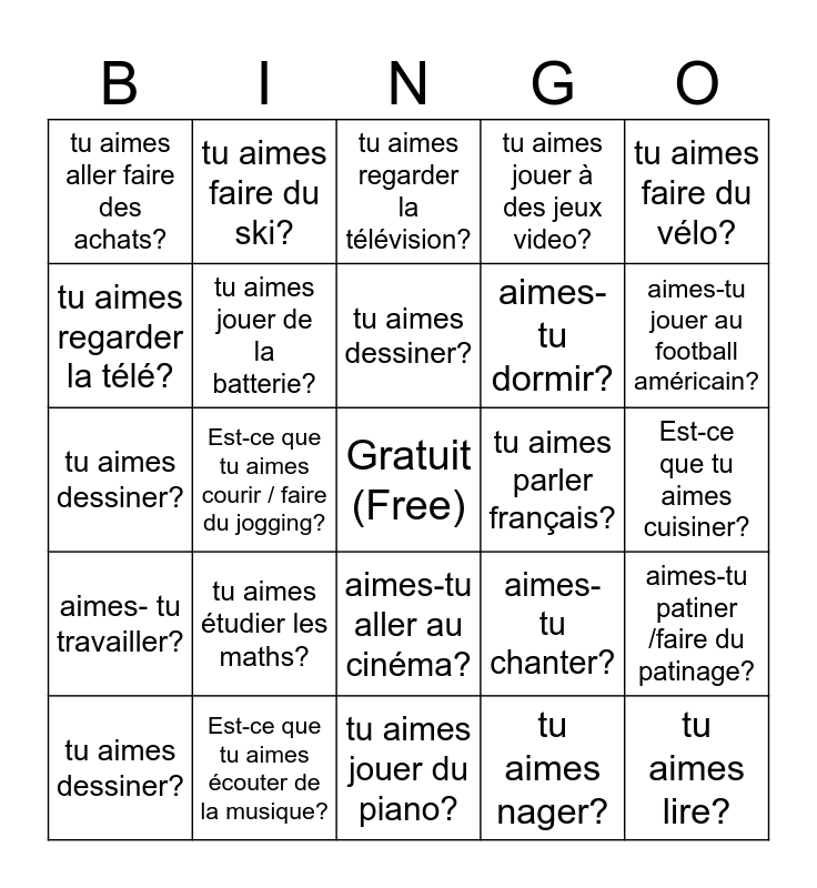 This bingo card has a free space and 24 words: tu aimes étudier les maths?, Est-ce que tu aimes écouter de la musique?, tu aimes dessiner?, tu aimes dessiner?, tu aimes faire du vélo?, tu aimes aller faire des achats?, tu aimes regarder la télé?, tu aimes faire du ski?, tu aimes parler français?, aimes-tu aller au cinéma?, aimes- tu dormir?, tu aimes dessiner?, aimes- tu chanter?, aimes-tu patiner /faire du patinage?, tu aimes jouer de la batterie?, tu aimes nager?, Est-ce que tu aimes cuisiner?, tu aimes regarder la télévision?, aimes-tu jouer au football américain?, Est-ce que tu aimes courir / faire du jogging?, tu aimes lire?, aimes- tu travailler?, tu aimes jouer à des jeux video? and tu aimes jouer du piano?.