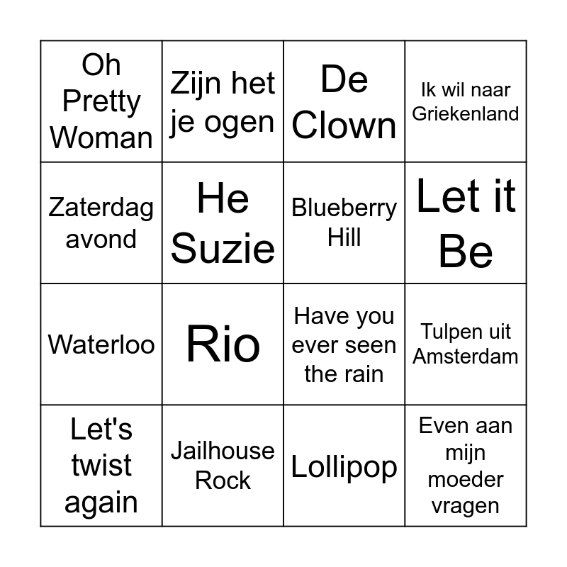 This bingo card has 32 words: Return to Sender, Living Doll, Tulpen uit Amsterdam, Boer Harms, Even aan mijn moeder vragen, Blueberry Hill, Zaterdag avond, Het is weer voorbij die mooie zomer, Zijn het je ogen, Paloma Blanca, Let it Be, De Clown, Zeven brieven, Rosamunde, Jailhouse Rock, Guus, Sophietje, Have you ever seen the rain, The Banjo Man, Een meisje voor altijd, Engel bewaarder, Rock Around The Clock, Lollipop, Mamma Mia, Let's twist again, Ik wil naar Griekenland, Waterloo, He Suzie, Oh Pretty Woman, Het laatste rondje, Dat is het einde and Rio.