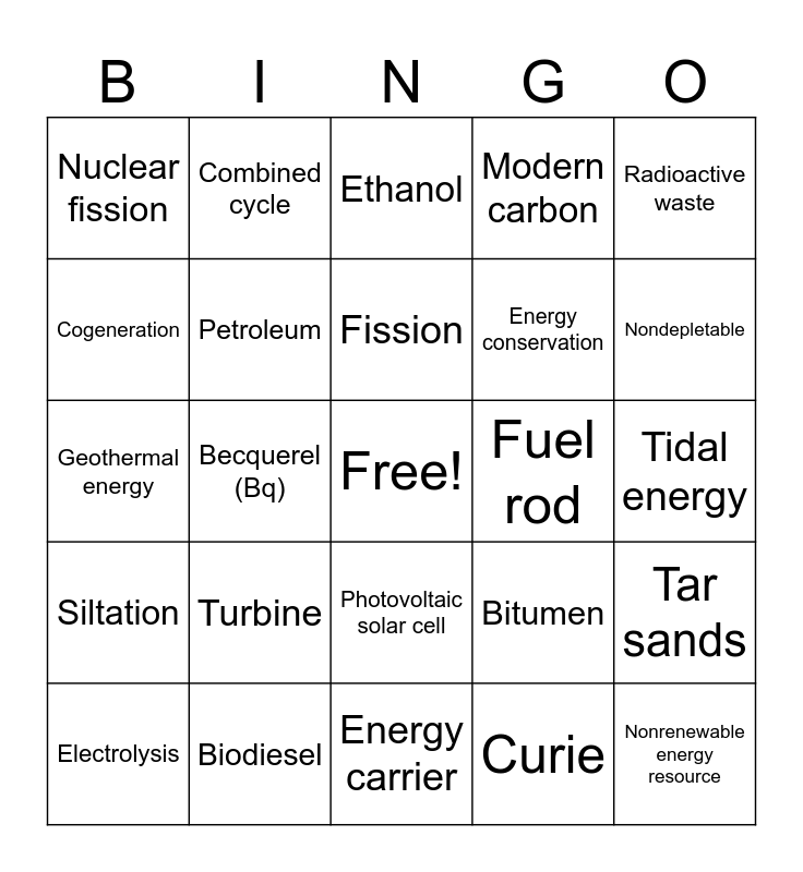 This bingo card has a free space and 52 words: Fossil Fuel, Nonrenewable energy resource, Nuclear fuel, Energy carrier, Turbine, Electrical grid, Combined cycle, Capacity, Cogeneration, Coal, Petroleum, Crude oil, Tar sands, Bitumen, Energy, intensity, Fission, Fuel rod, Control rod, Radioactive waste, Becquerel (Bq), Curie, Nuclear fission, Energy conservation, Peak Demand, Passive solar design, Thermal mass, Potentially renewable, Nondepletable, Renewable, Biofuel, Modern carbon, Fossil carbon, Carbon-neutral, Net removal, Ethanol, Biodiesel, Flex-fuel vehicle, Hydroelectricity, Run-of-the-river, Water impoundment, Tidal energy, Siltation, Active solar energy, Photovoltaic solar cell, Wind energy, Wind turbine, Geothermal energy, Ground source heat pump, Fuel cell, Electrolysis and Smart grid.