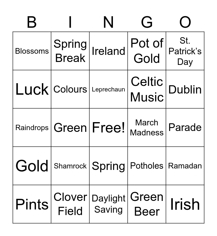 This bingo card has a free space and 37 words: Go Further Women, Employee Appreciation, Holi, Colours, Ramadan, Shamrock, Leprechaun, Rainbow, St. Patrick’s Day, Clover, Green, Pot of Gold, Irish, Parade, Luck, Gold, Celtic, Ireland, Spring, March Madness, Blossoms, Dublin, Pints, Daylight Saving, Leprechaun Hat, Green Beer, Spring Break, Frost, Tulips, Charms, Fiddle, Clover Field, Raindrops, Shamrock Garden, Potholes, Celtic Music and Lucky Charm.
