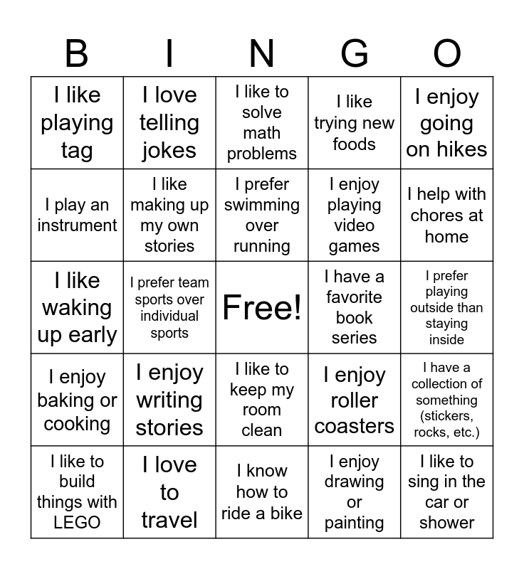 This bingo card has a free space and 24 words: I enjoy writing stories, I love to travel, I prefer swimming over running, I like to build things with LEGO, I enjoy going on hikes, I like playing tag, I play an instrument, I love telling jokes, I have a favorite book series, I like to keep my room clean, I enjoy playing video games, I like waking up early, I enjoy roller coasters, I have a collection of something (stickers, rocks, etc.), I like making up my own stories, I enjoy drawing or painting, I prefer playing outside than staying inside, I like to solve math problems, I help with chores at home, I prefer team sports over individual sports, I like to sing in the car or shower, I enjoy baking or cooking, I like trying new foods and I know how to ride a bike.
