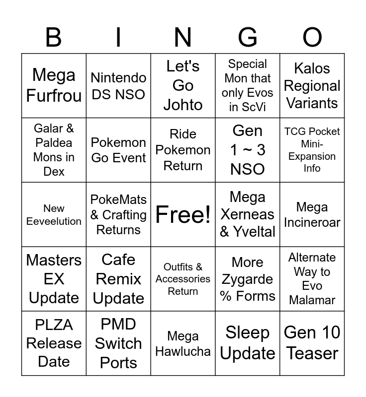 This bingo card has a free space and 24 words: Cafe Remix Update, PMD Switch Ports, Ride Pokemon Return, PLZA Release Date, Kalos Regional Variants, Mega Furfrou, Galar & Paldea Mons in Dex, Nintendo DS NSO, Mega Xerneas & Yveltal, Outfits & Accessories Return, Gen 1 ~ 3 NSO, New Eeveelution, More Zygarde % Forms, Alternate Way to Evo Malamar, Pokemon Go Event, Sleep Update, Mega Incineroar, Let's Go Johto, TCG Pocket Mini-Expansion Info, PokeMats & Crafting Returns, Gen 10 Teaser, Masters EX Update, Special Mon that only Evos in ScVi and Mega Hawlucha.