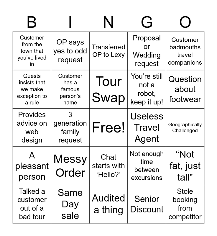 This bingo card has a free space and 41 words: Tells us how to run our business, Provides advice on web design, Chat in translation, Customer has a famous person’s name, Same Day sale, Chat starts with ‘Hello?’, Tour Swap, ADA Question, Customer badmouths travel companions, A pleasant person, 3 generation family request, Proposal or Wedding request, Stole booking from competitor, Geographically Challenged, Useless Travel Agent, Messy Order, Charge the card on file, Customer from the town that you’ve lived in, Calmed down an anxious customer, Transferred OP to Lexy, “Not fat, just tall”, Email EAT for space, Audited a thing, You’re still not a robot, keep it up!, GoldStar Sold Out, Military Discount, Senior Discount, LAT - Filled a canoe 8 to 10 pax, Question about footwear, Juneau Meditation Tour Sold, Customer gets political, OP says yes to odd request, Talked a customer out of a bad tour, Returning chat, Not enough time between excursions, Guests insists that we make exception to a rule, Vancouver Tour Sold, Seattle Tour Sold, Fairbanks Tour Sold, IP address from Montana and IP address from Wisconsin.