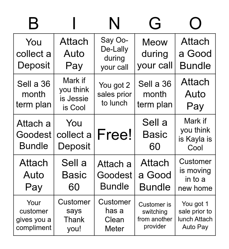 This bingo card has a free space and 24 words: Your customer gives you a compliment, Sell a Basic 60, You got 2 sales prior to lunch, Customer is switching from another provider, Attach a Good Bundle, You collect a Deposit, Attach Auto Pay, Say Oo-De-Lally during your call, Sell a Basic 60, Mark if you think is Kayla is Cool, Attach a Goodest Bundle, Mark if you think is Jessie is Cool, Attach a Good Bundle, Customer is moving in to a new home, Sell a 36 month term plan, Customer says Thank you!, Customer has a Clean Meter, Meow during your call, Attach Auto Pay, Attach Auto Pay, You collect a Deposit, Attach a Goodest Bundle, Sell a 36 month term plan and You got 1 sale prior to lunch Attach Auto Pay.