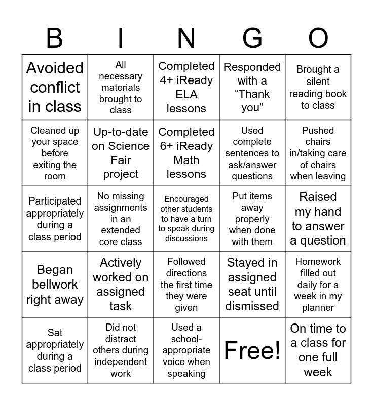 This bingo card has 32 words: Free!, No missing assignments in a core class, No missing assignments in an extended core class, Passed an assessment, Began bellwork right away, Up-to-date on Science Fair project, Brought a silent reading book to class, Homework filled out daily for a week in my planner, All necessary materials brought to class, On time to a class for one full week, Completed 6+ iReady Math lessons, Completed 4+ iReady ELA lessons, Showed kindness to others without expecting anything in return, Worked to complete a task even when it is challenging, Put items away properly when done with them, Listened attentively during a class period, Sat appropriately during a class period, Participated appropriately during a class period, Followed directions the first time they were given, Actively worked on assigned task, Stayed in assigned seat until dismissed, Participated in group discussions, Raised my hand to answer a question, Did not distract others during independent work, Encouraged other students to have a turn to speak during discussions, Responded with a “Thank you”, Used complete sentences to ask/answer questions, Cleaned up your space before exiting the room, Avoided conflict in class, Used a school-appropriate voice when speaking, Walked in the hallways at school and Pushed chairs in/taking care of chairs when leaving.