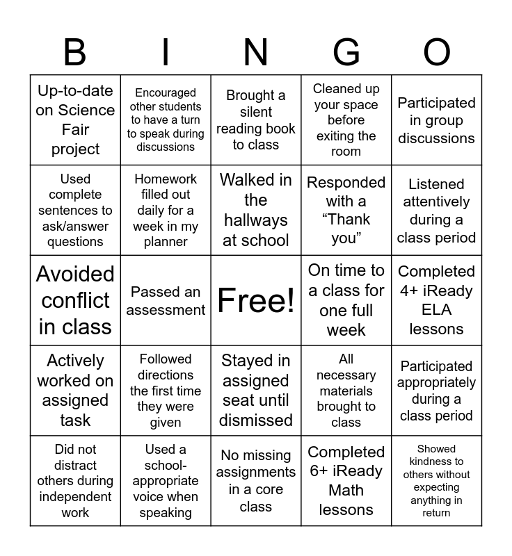 This bingo card has a free space and 31 words: No missing assignments in a core class, No missing assignments in an extended core class, Passed an assessment, Began bellwork right away, Up-to-date on Science Fair project, Brought a silent reading book to class, Homework filled out daily for a week in my planner, All necessary materials brought to class, On time to a class for one full week, Completed 6+ iReady Math lessons, Completed 4+ iReady ELA lessons, Showed kindness to others without expecting anything in return, Worked to complete a task even when it is challenging, Put items away properly when done with them, Listened attentively during a class period, Sat appropriately during a class period, Participated appropriately during a class period, Followed directions the first time they were given, Actively worked on assigned task, Stayed in assigned seat until dismissed, Participated in group discussions, Raised my hand to answer a question, Did not distract others during independent work, Encouraged other students to have a turn to speak during discussions, Responded with a “Thank you”, Used complete sentences to ask/answer questions, Cleaned up your space before exiting the room, Avoided conflict in class, Used a school-appropriate voice when speaking, Walked in the hallways at school and Pushed chairs in/taking care of chairs when leaving.